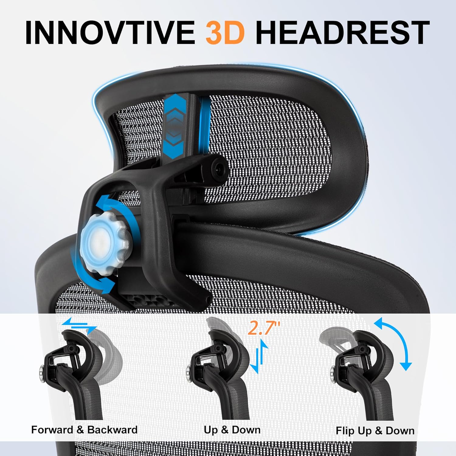 The high-back mesh backrest provides full spinal coverage from the lumbar region up through the shoulders, with an adjustable lumbar that lets you control the depth of support , a feature found in only about 75% of chairs in this category. The 3D adjustable headrest moves in height and angle to support the neck during recline, which is especially useful for taller users who often find headrests too low on standard chairs.