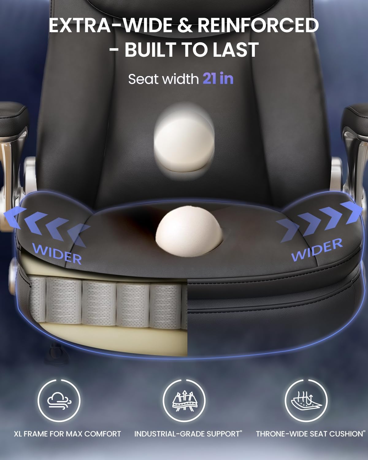The extra-wide seat design supports various sitting positions throughout the day without feeling restrictive.