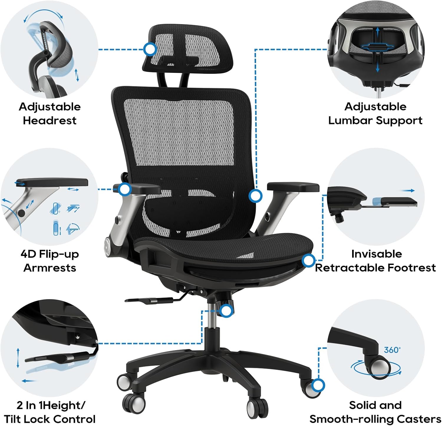 Ergonomic Mesh Office Chair with Retractable Footrest - High Back Computer Chair, Lumbar Support, Adjustable Armrest and Headrest, Durable Base - Multifunctional Home Office Desk Chair for Adults
