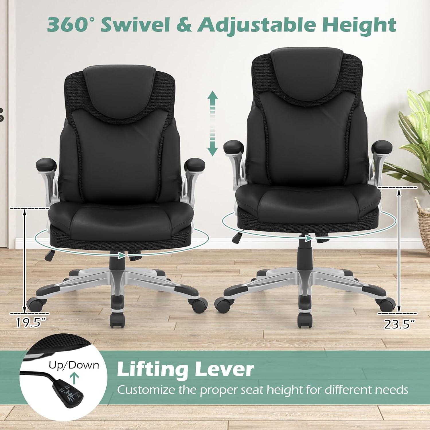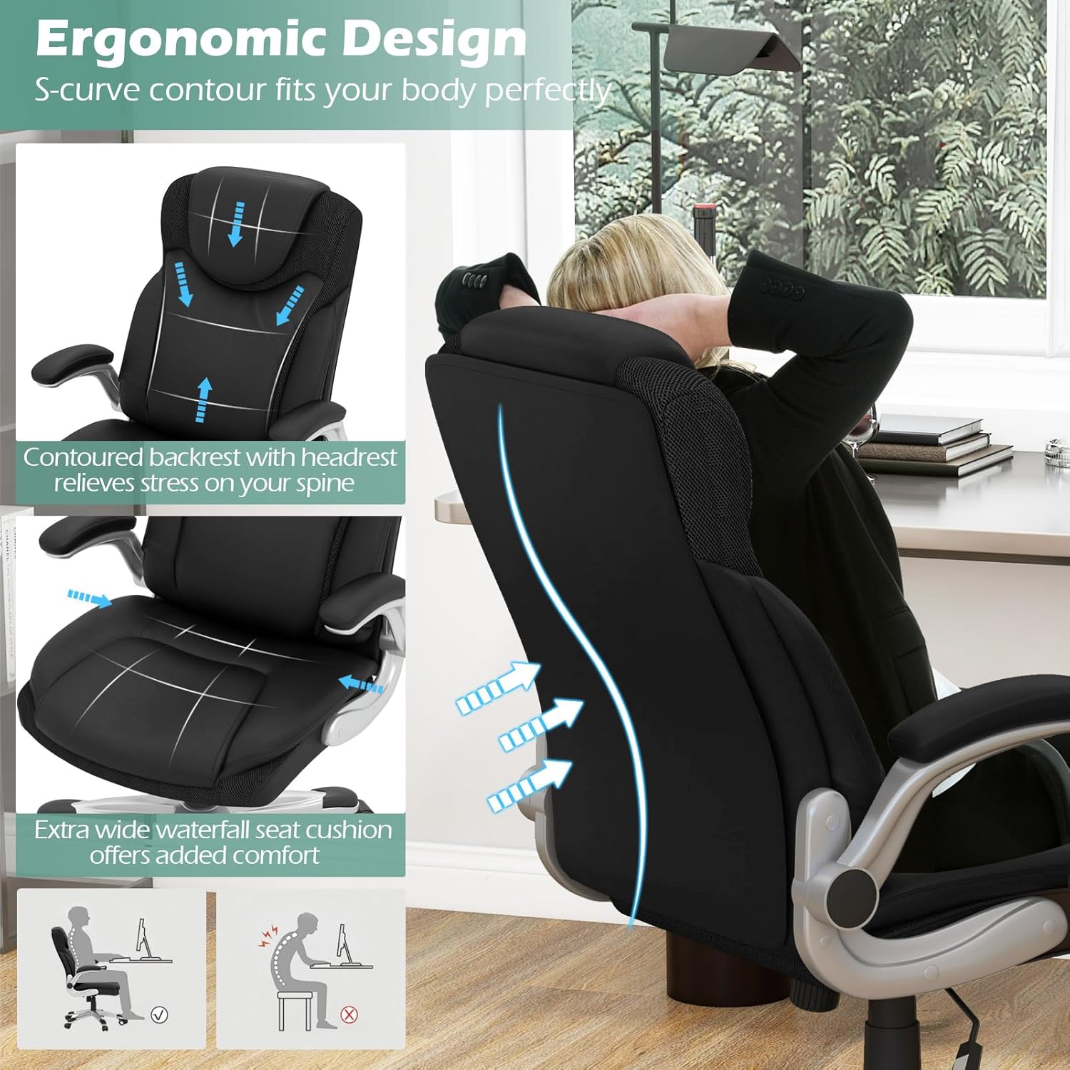 The COSTWAY Executive Office Chair delivers a professional look with PU leather upholstery and a 350 lb weight capacity as an entry-level option. With flip-up armrests, built-in lumbar support, and a rocking function, it checks the essential boxes for home office and executive settings without overcomplicating the feature set.