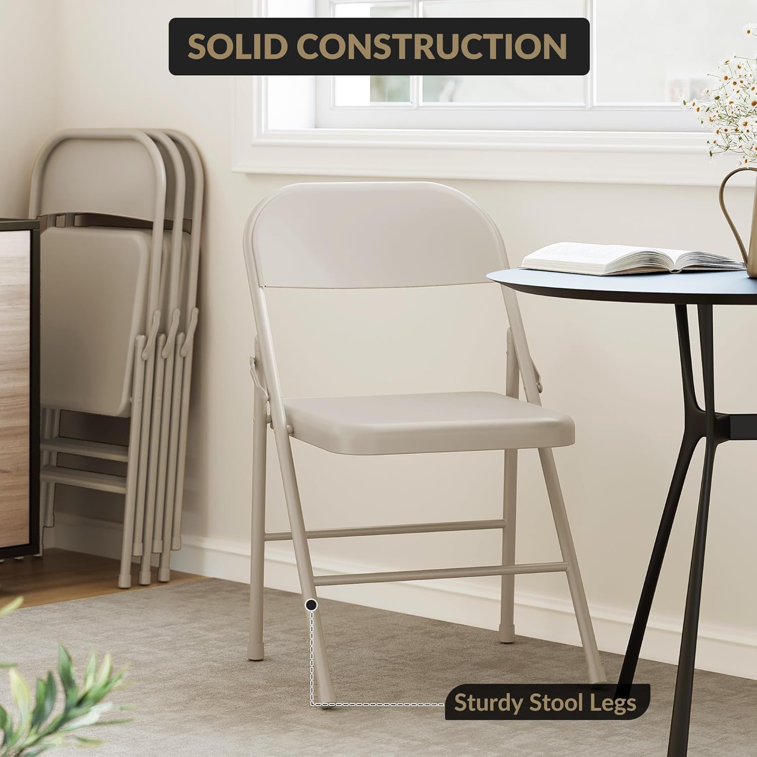 The steel base and metal frame construction give these chairs a commercial-grade feel despite each weighing only 8.2 lbs. The 350 lb weight capacity is impressive for a folding chair and speaks to the frame's structural integrity. The legs and frame should hold up well to repeated folding, stacking, and use across various surfaces over years of service.