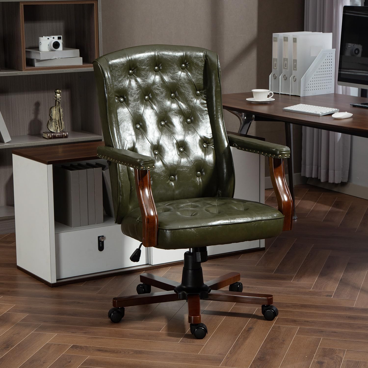 The tufted faux leather, rivet details, and wingback design give this chair a distinctly executive, vintage aesthetic that adds a touch of elegance to traditional and transitional office spaces. The green colorway is a bold choice , it works well as a statement piece in a home office or private workspace but may stand out in more conservative corporate settings.