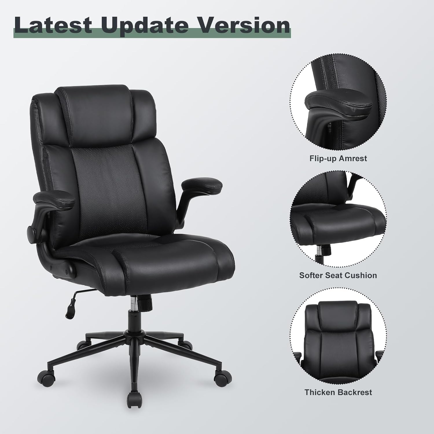 Office Chair Adjustable Desk Chair Mid Back Executive Comfortable Bonded Leather Ergonomic Back Support Home Computer Chair with Padded Flip-up Armrest Swivel Wheels (Black)