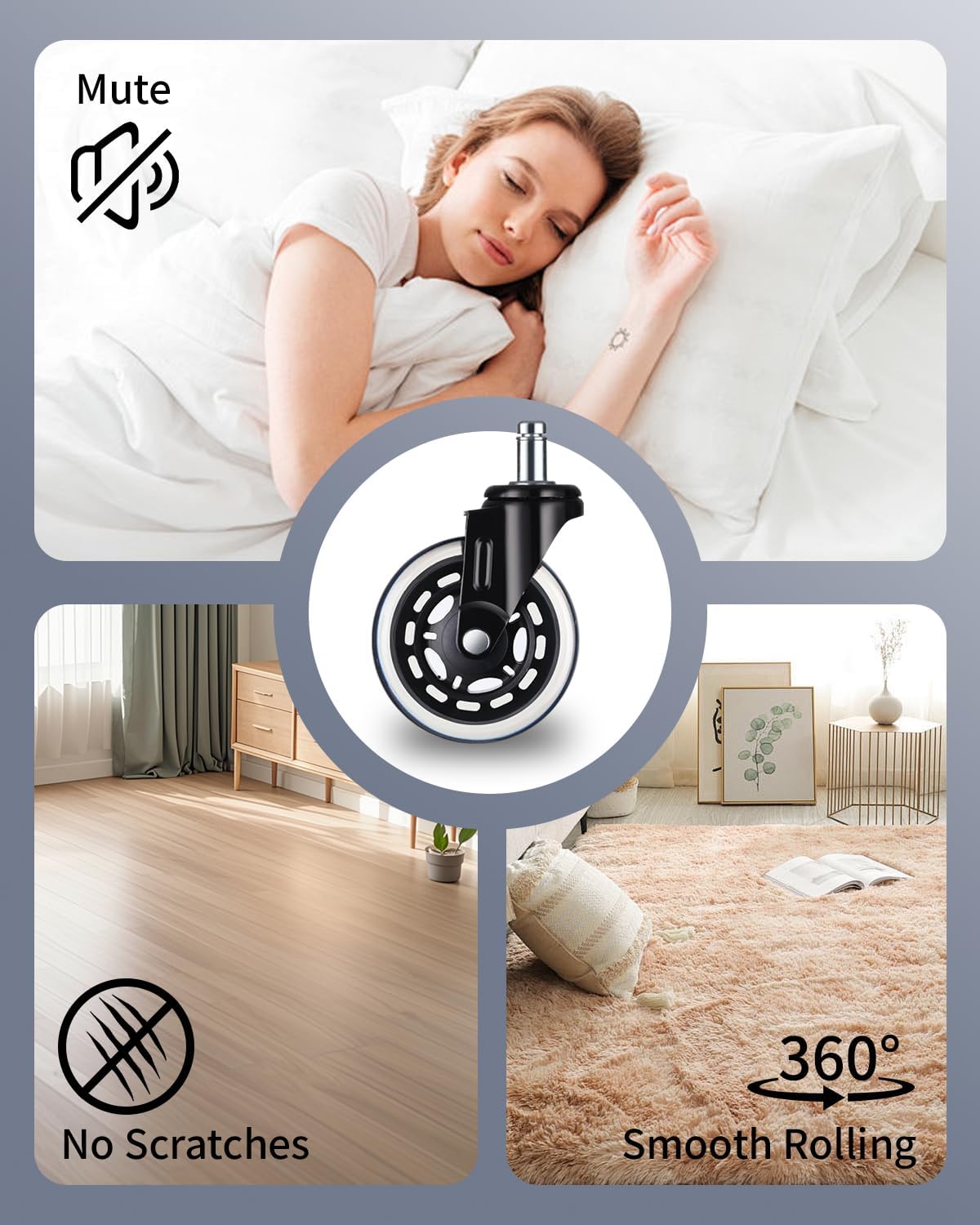 Quiet rubber casters glide smoothly across carpet and hard floors without scuffing