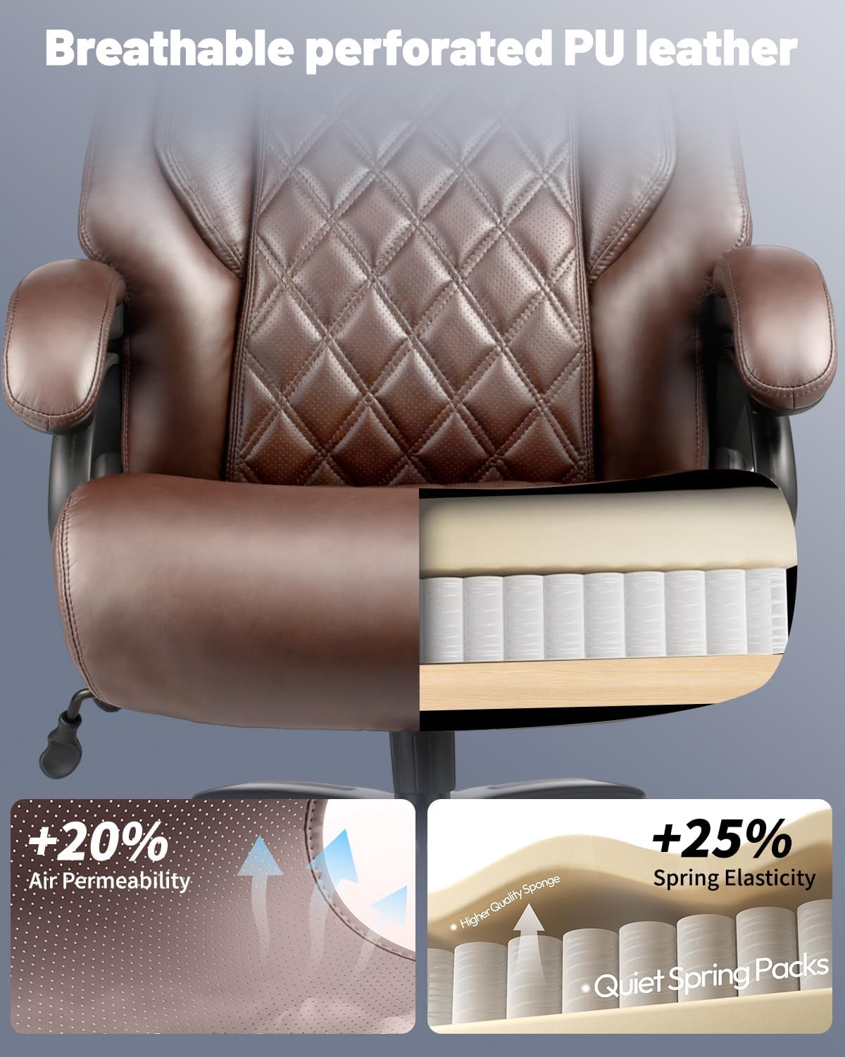 The 24.3-inch wide by 20.52-inch deep seat is generously proportioned, giving larger users the room they need without feeling squeezed. The 6.5-inch thick PU leather cushion is notably thicker than the industry average, and customers consistently report the seat stays soft and supportive during extended hours.