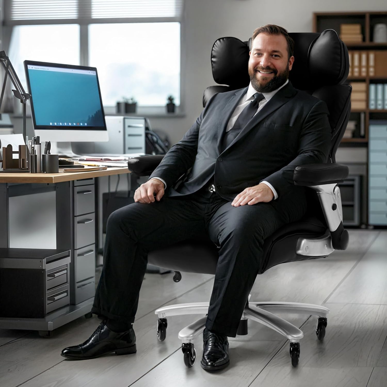 The Hexago 600lb office chair stands out as a heavy-duty executive desk chair built for larger frames, featuring an innovative inflatable adjustable lumbar support system that lets you dial in precise back support. With a 600 lb weight capacity, wider seat dimensions, and breathable PU leather upholstery, it's purpose-built for big and tall users who need a chair that won't quit on them.