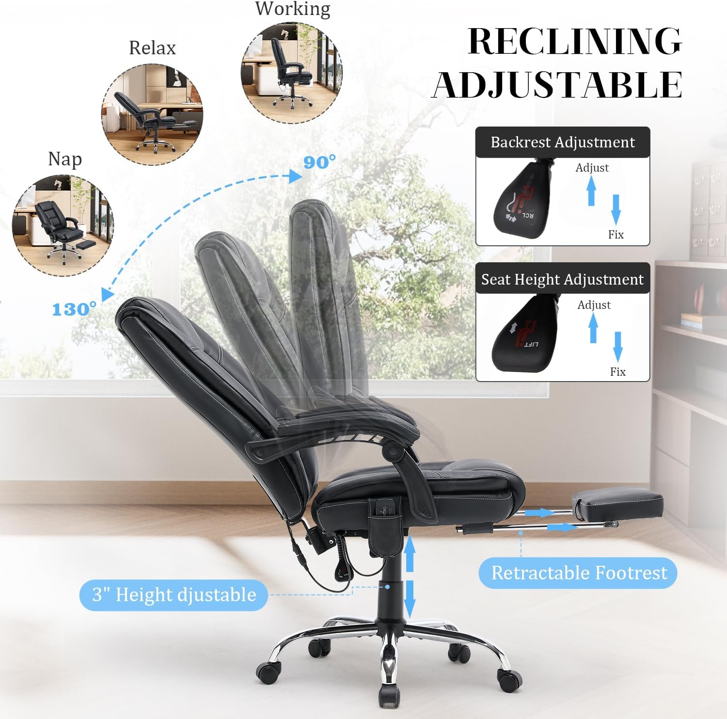 Massage Office Chair with Foot Rest 6 Points Vibration and Heat Home Office Desk Chairs for Heavy People 400lbs Reclining Managerial Chairs Ergonomic Executive Chair (Black)