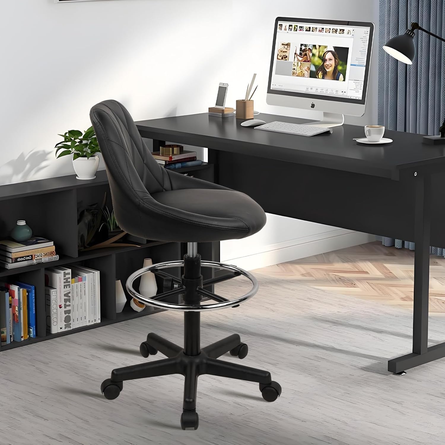 The KLASIKA Drafting Chair is a PU leather stool designed for standing desk users who need elevated seating with built-in back support. Its wide seat height range of 24.4-33 inches and retractable footrest make it a practical pick for drafting tables, kitchen counters, and adjustable-height workstations.
