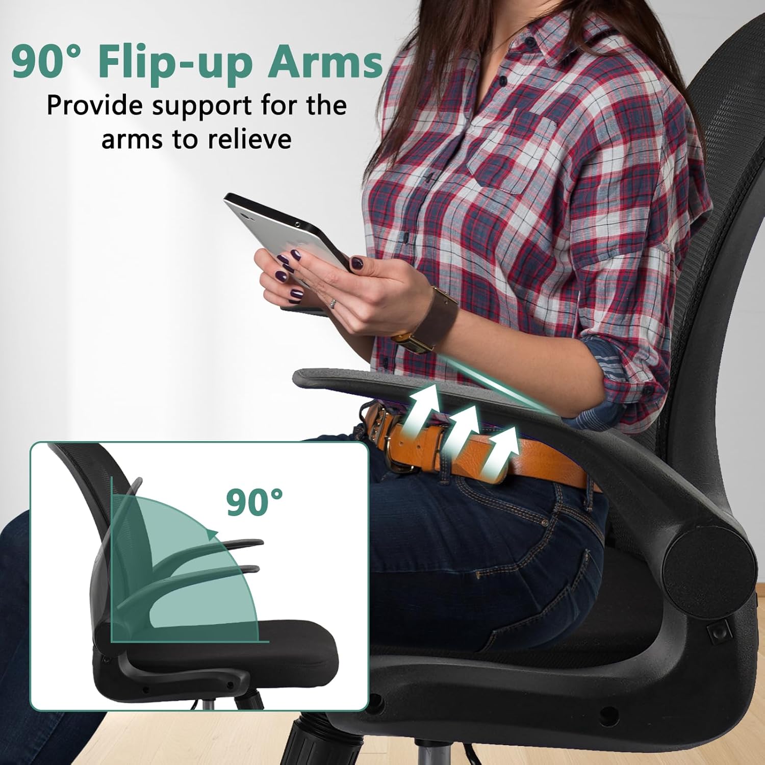 The flip-up arms pivot upward and out of the way completely, letting you slide the chair tight against your desk for an unobstructed typing position. This is one of the top advantages of this design , you get armrest support when you want it and zero interference when you don't.