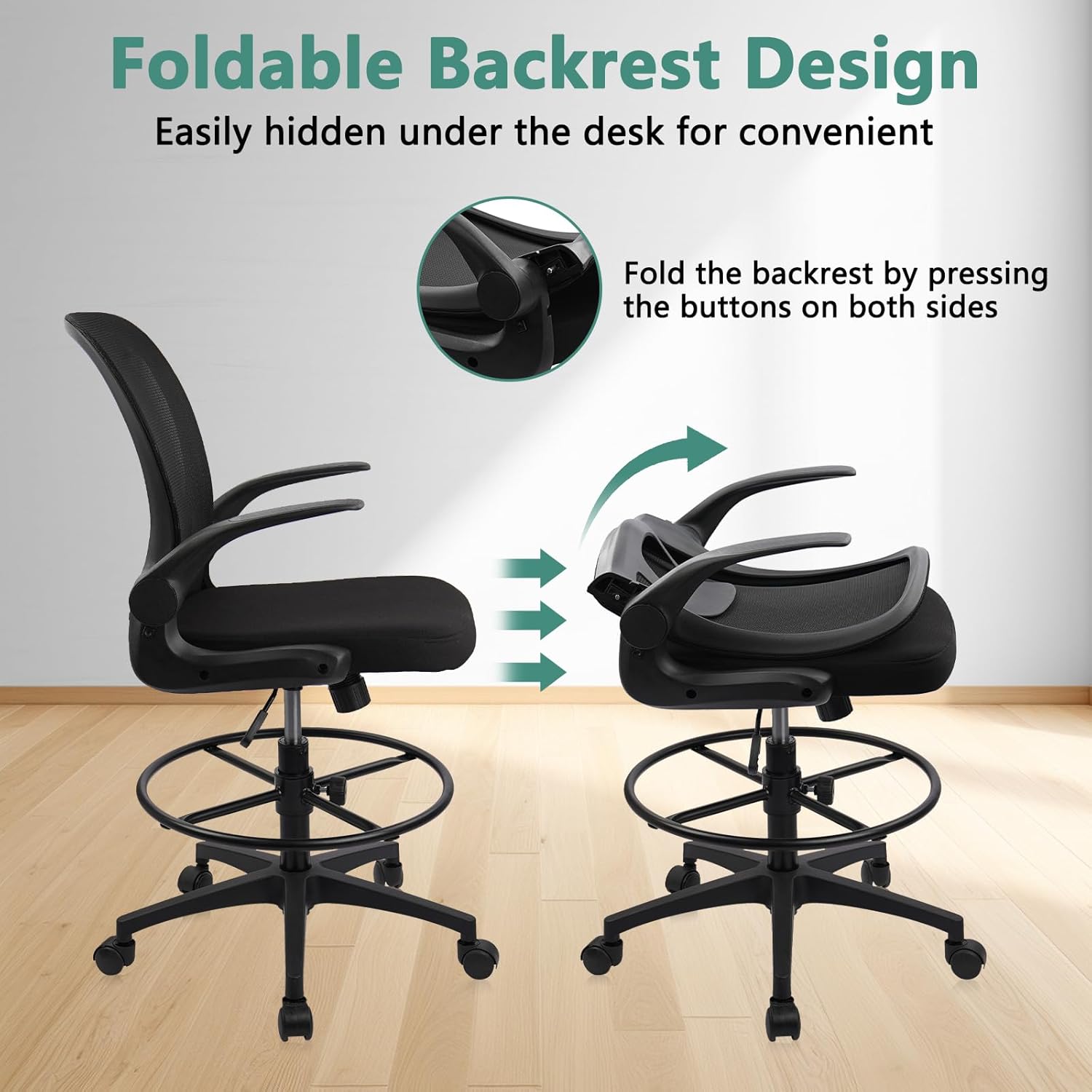 Foldable backrest and flip-up arms allow the chair to tuck completely under a standing desk, freeing up floor space in small offices