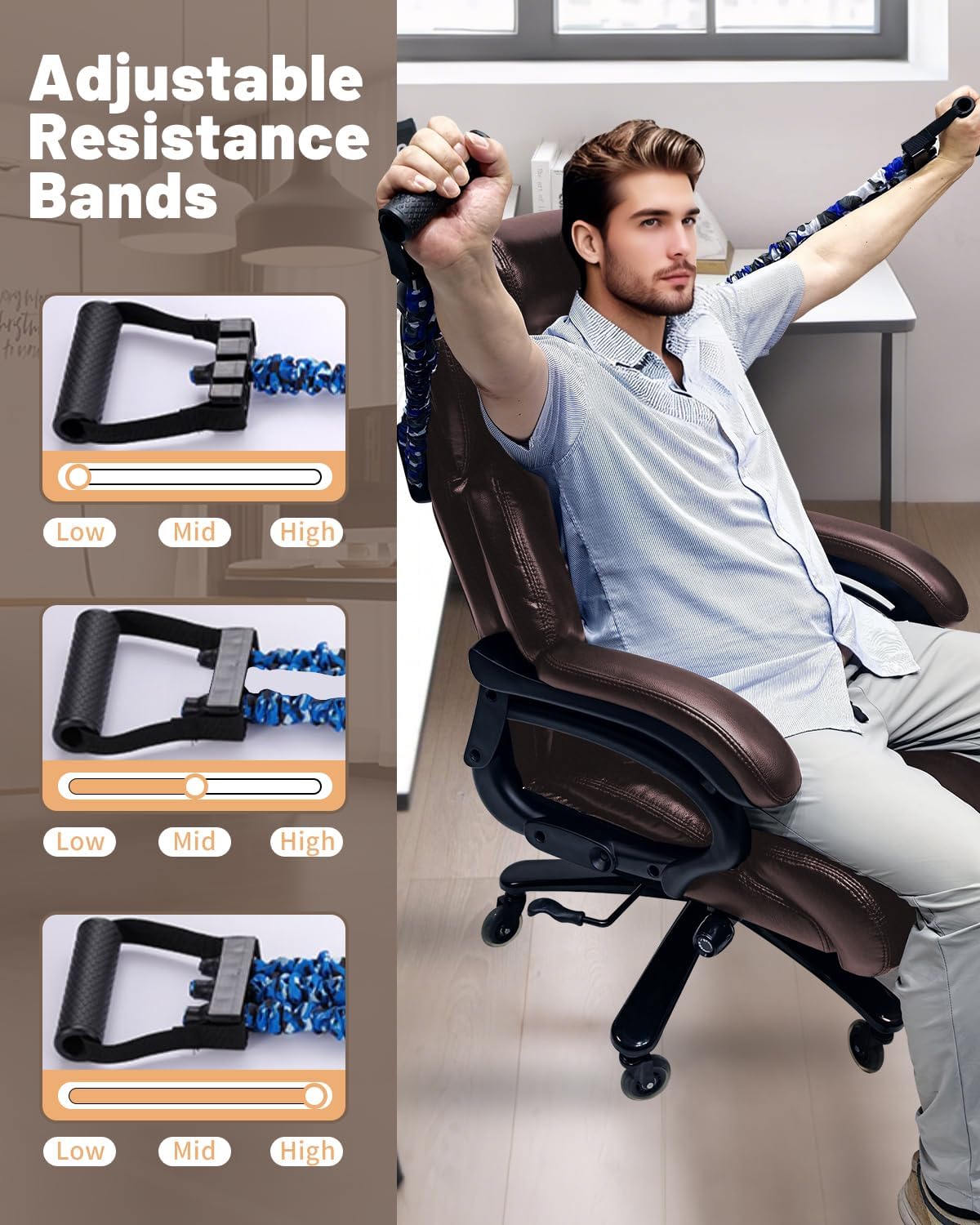 The built-in resistance band lets you do light upper body exercises , arm curls, stretches, and shoulder work , without leaving your chair. It encourages movement breaks during long desk sessions, which helps with circulation and reduces the stiffness that comes from static seating positions throughout the day.