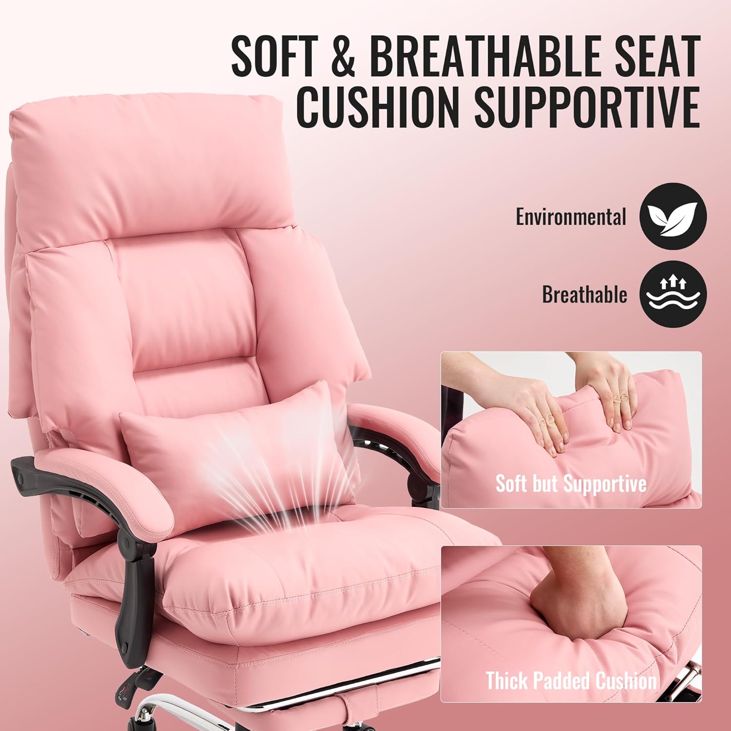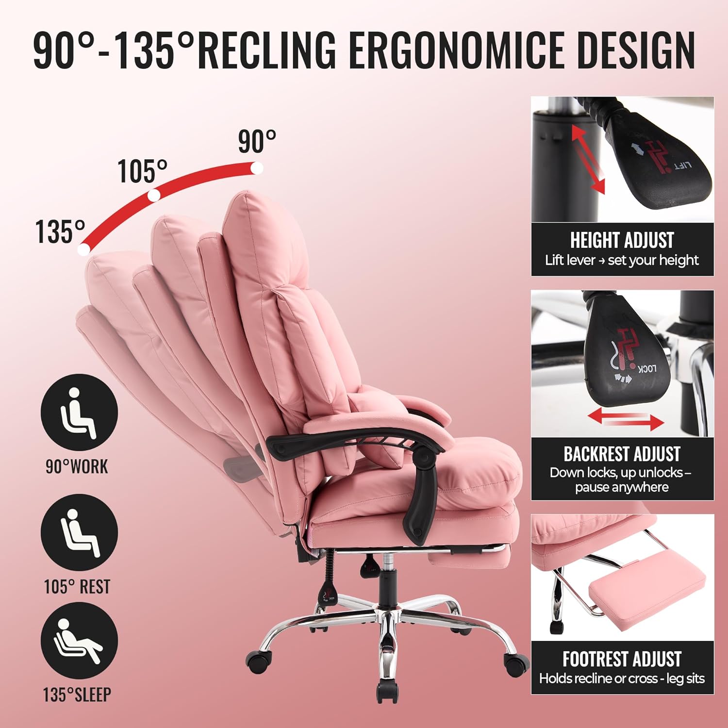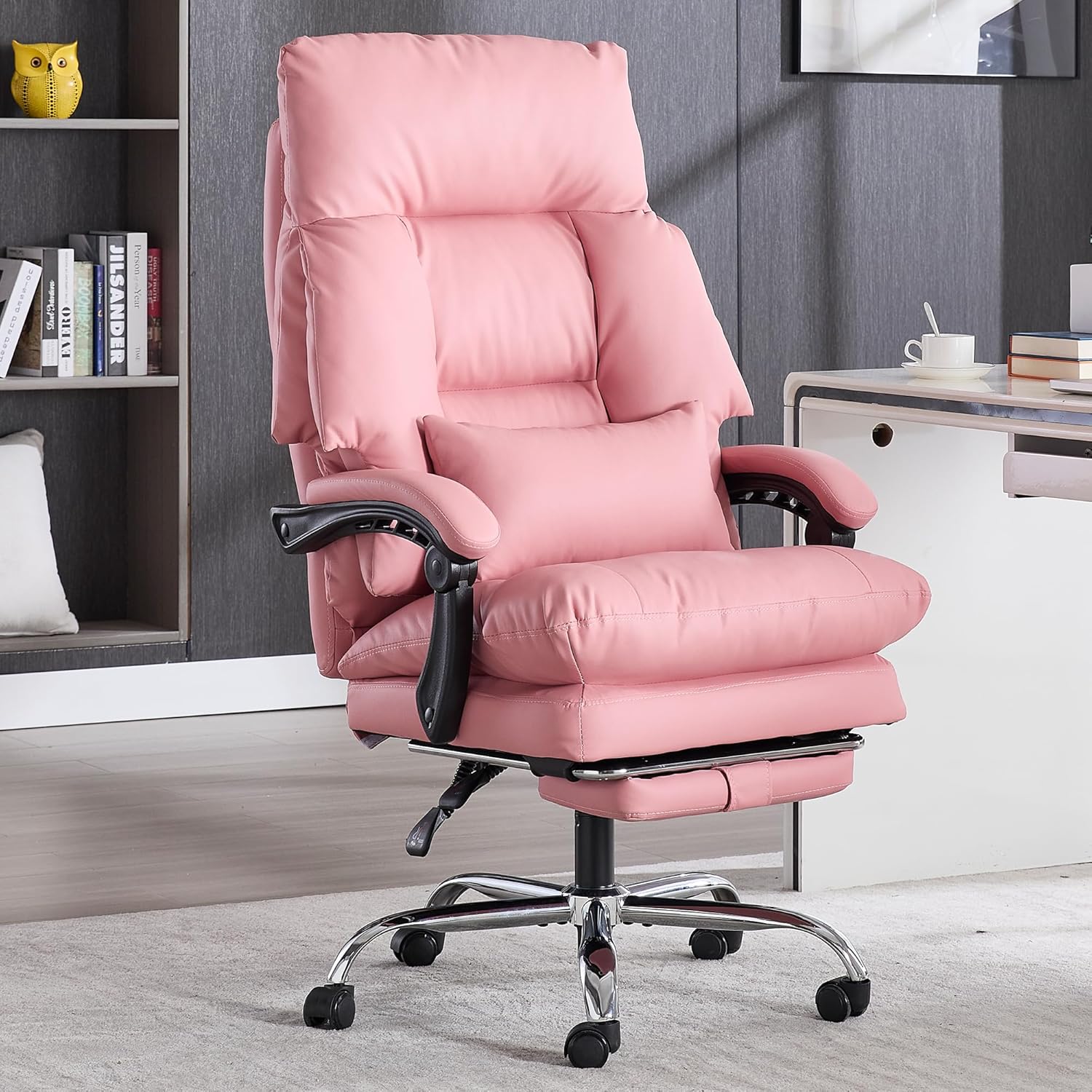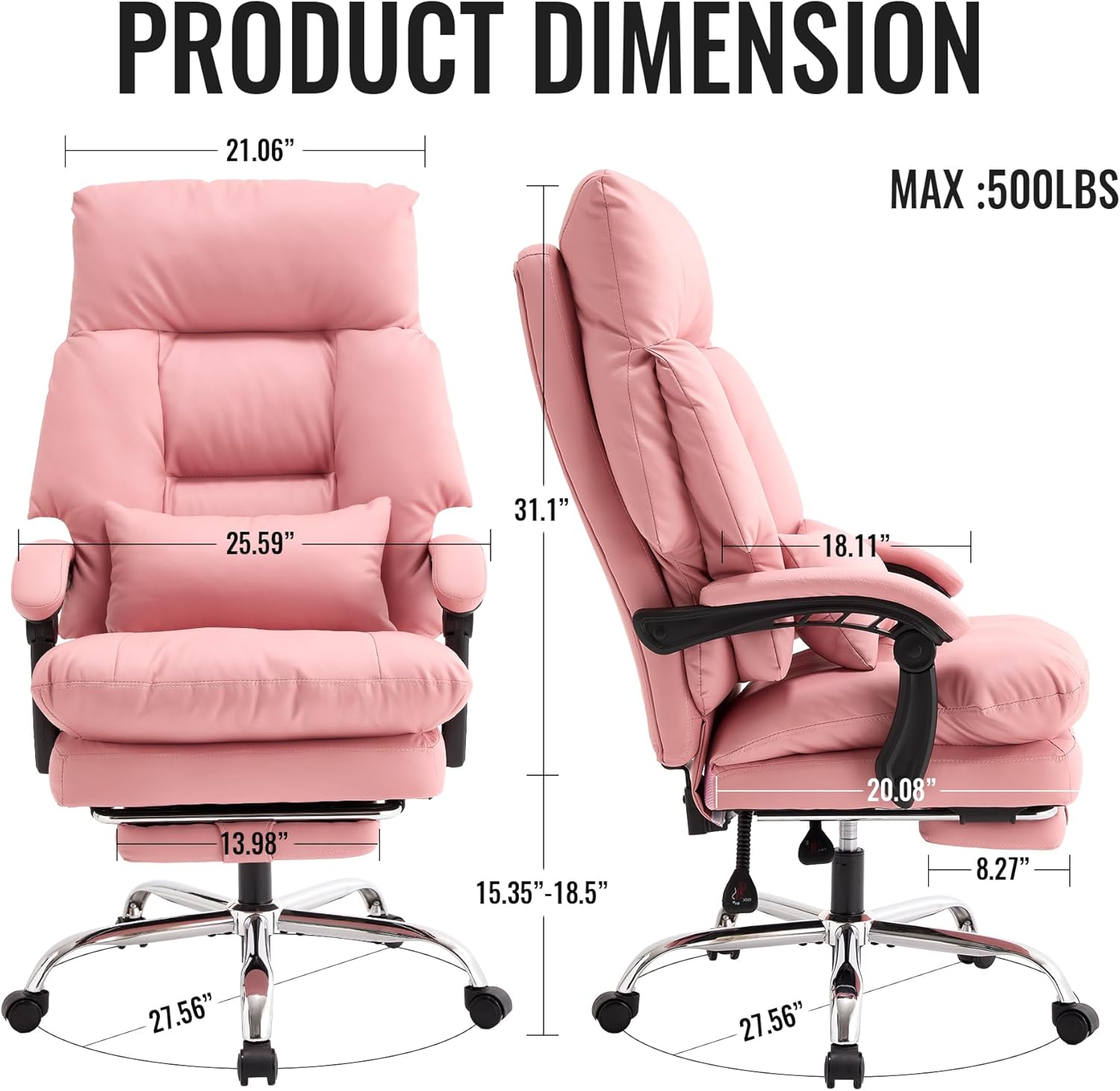 A heavy-duty pink executive chair built for bigger frames, with a 500 lb weight capacity and an extra-wide 25.59-inch seat that gives larger users room to sit comfortably. The 135-degree recline with a built-in footrest makes it a solid pick for home offices and gaming setups where you want to kick back between tasks.