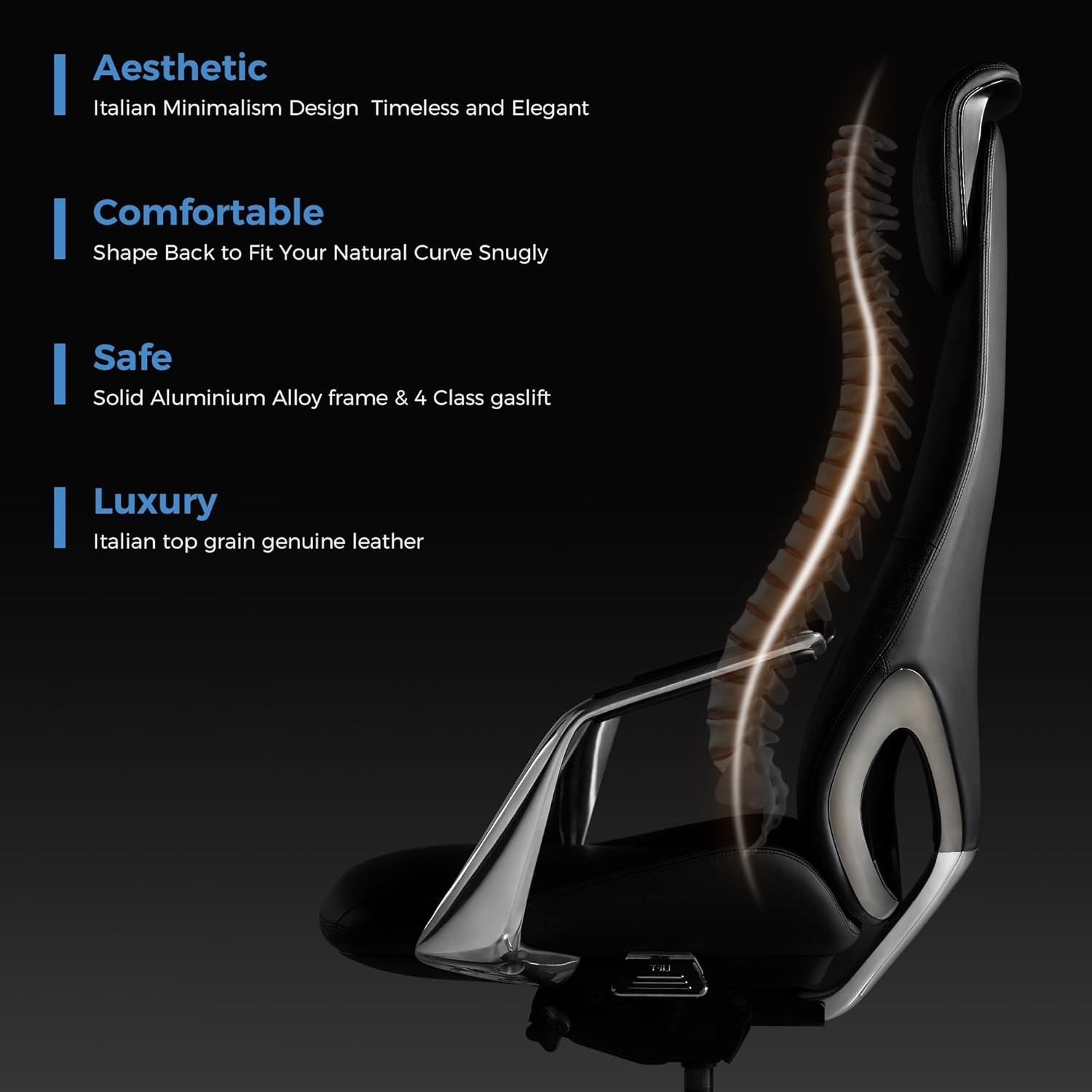 The TOMU Genuine Leather Executive Office Chair delivers where it matters most for an executive chair , real top grain leather, solid aluminum construction, and legitimate ergonomic adjustments including lumbar depth and seat depth. It's a strong choice for professionals who want their chair to look and feel premium without sacrificing back support.